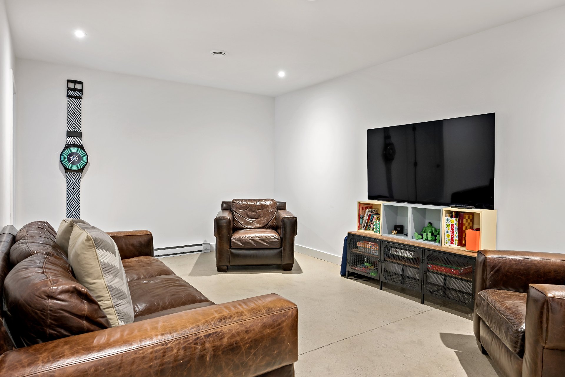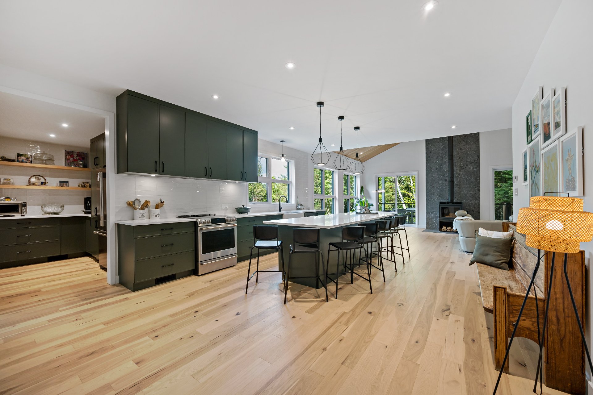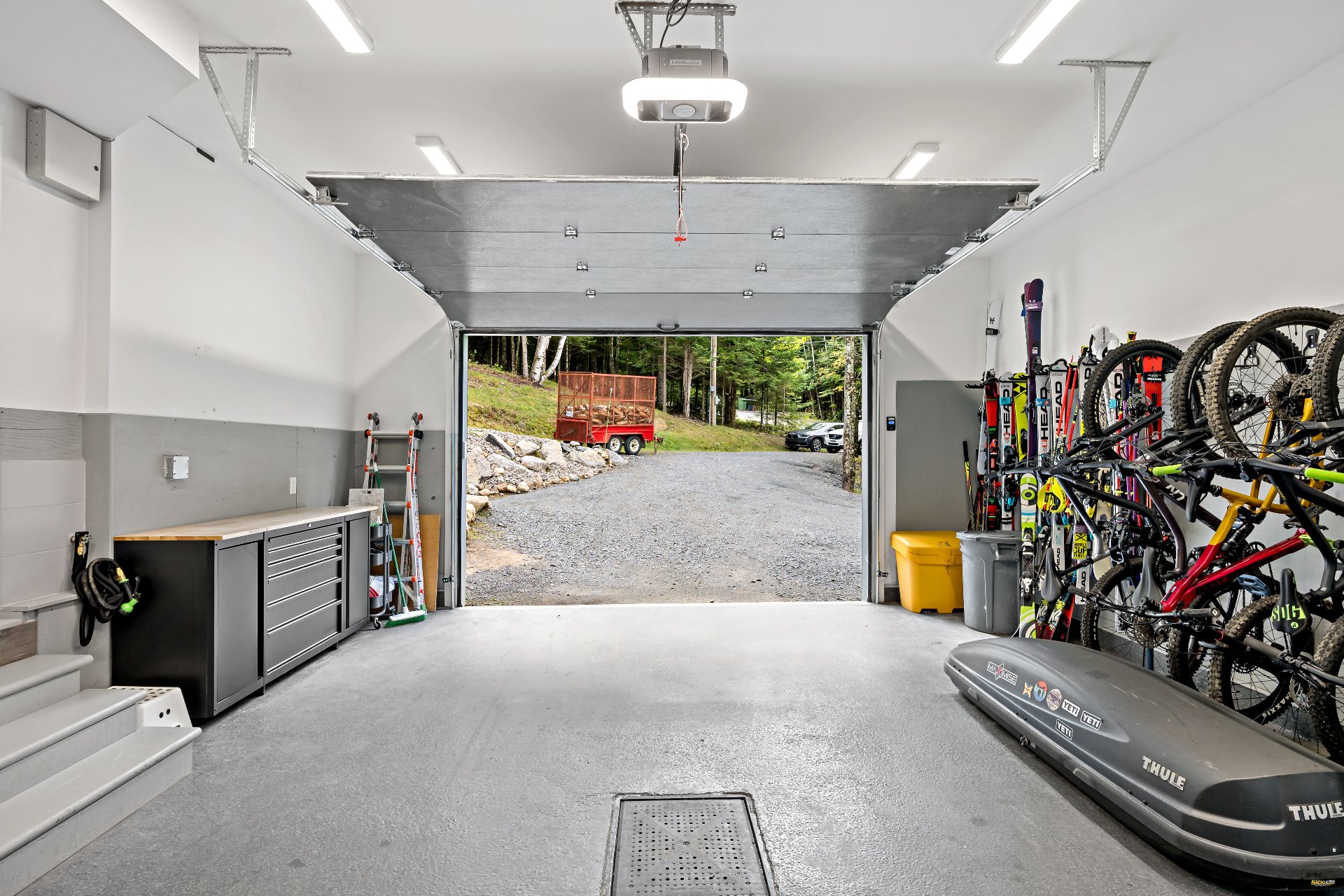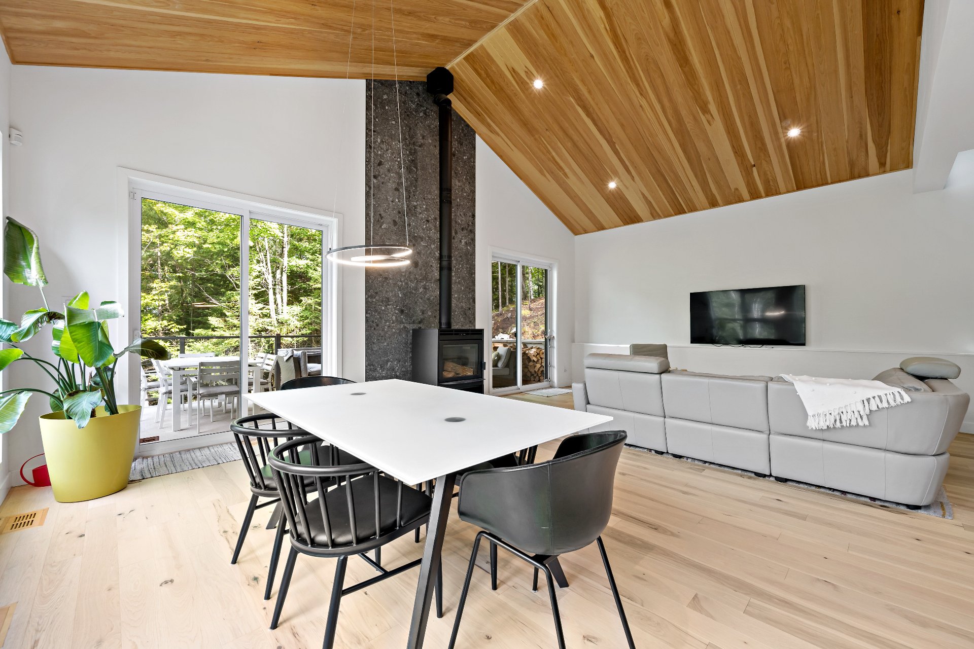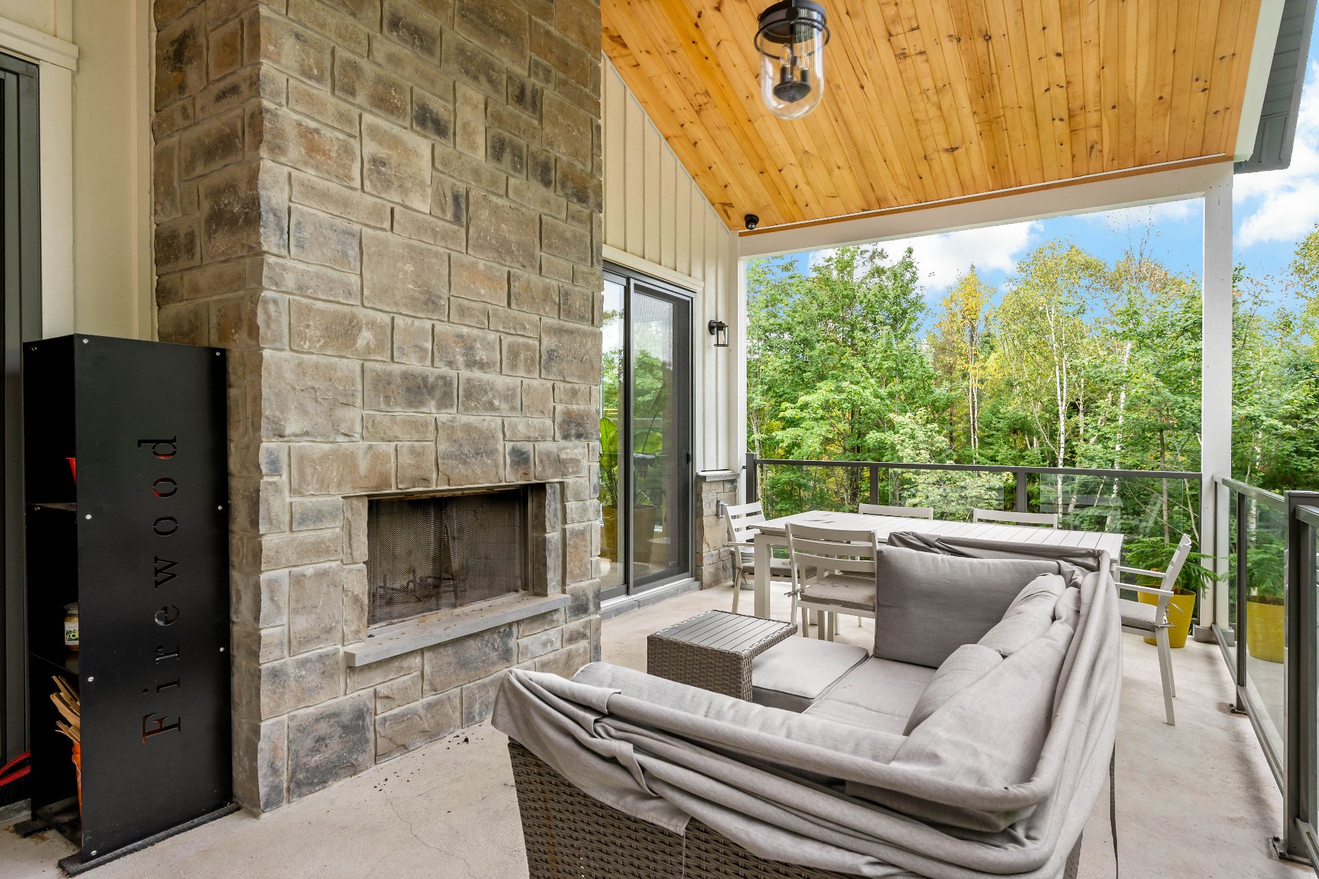 Meubles, électroménagers, essentiels de cuisine, rideaux, stores, luminaires, aspirateur central, télévision au sous-sol, étagère pour le bois de foyer sur le balcon.