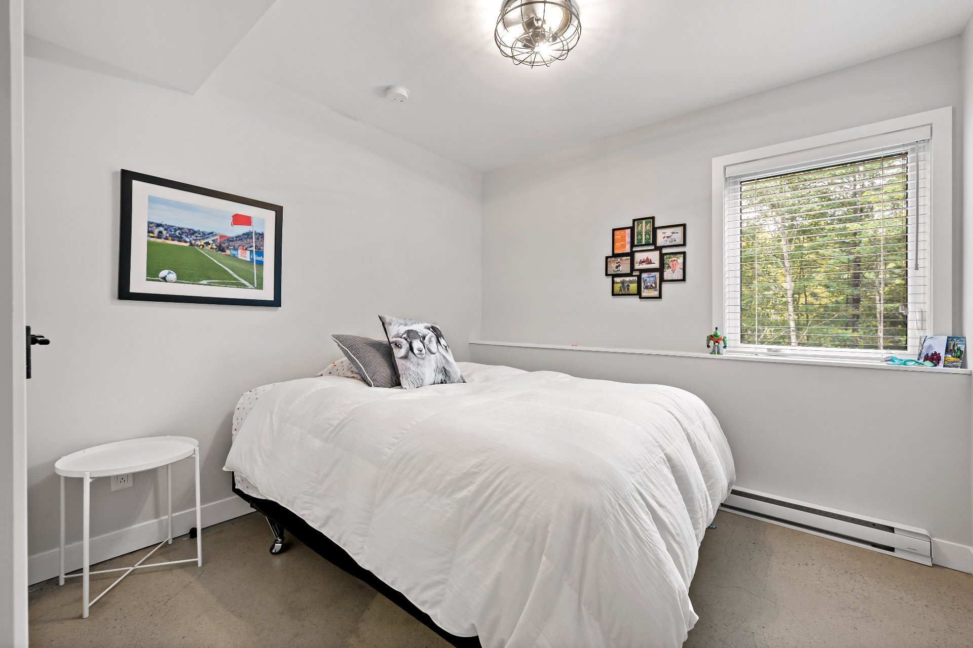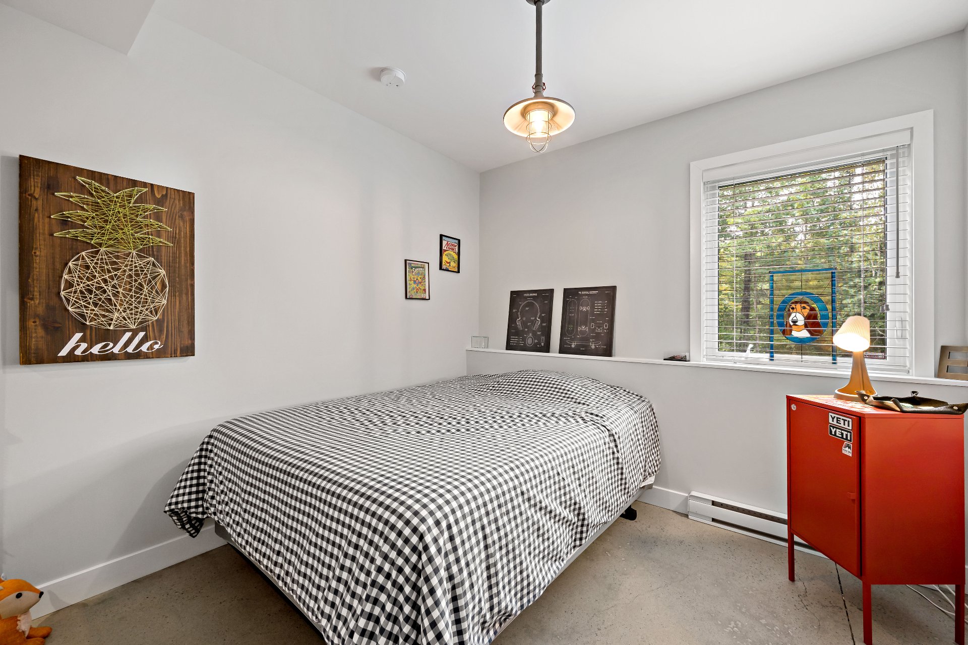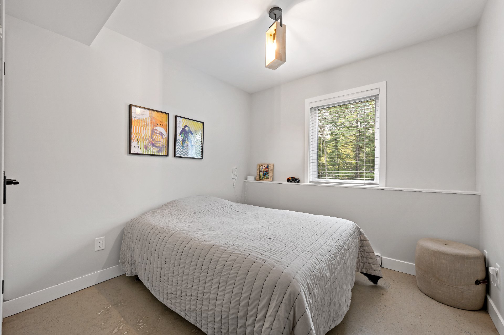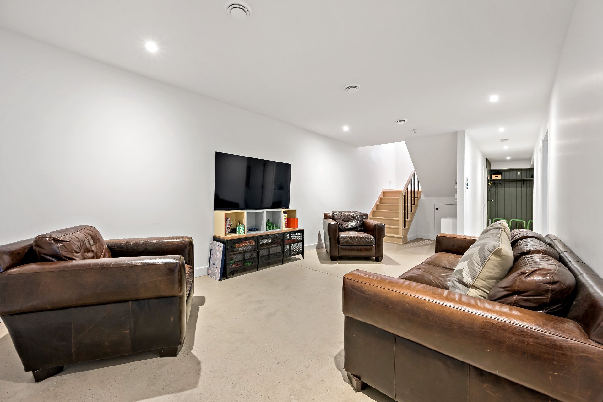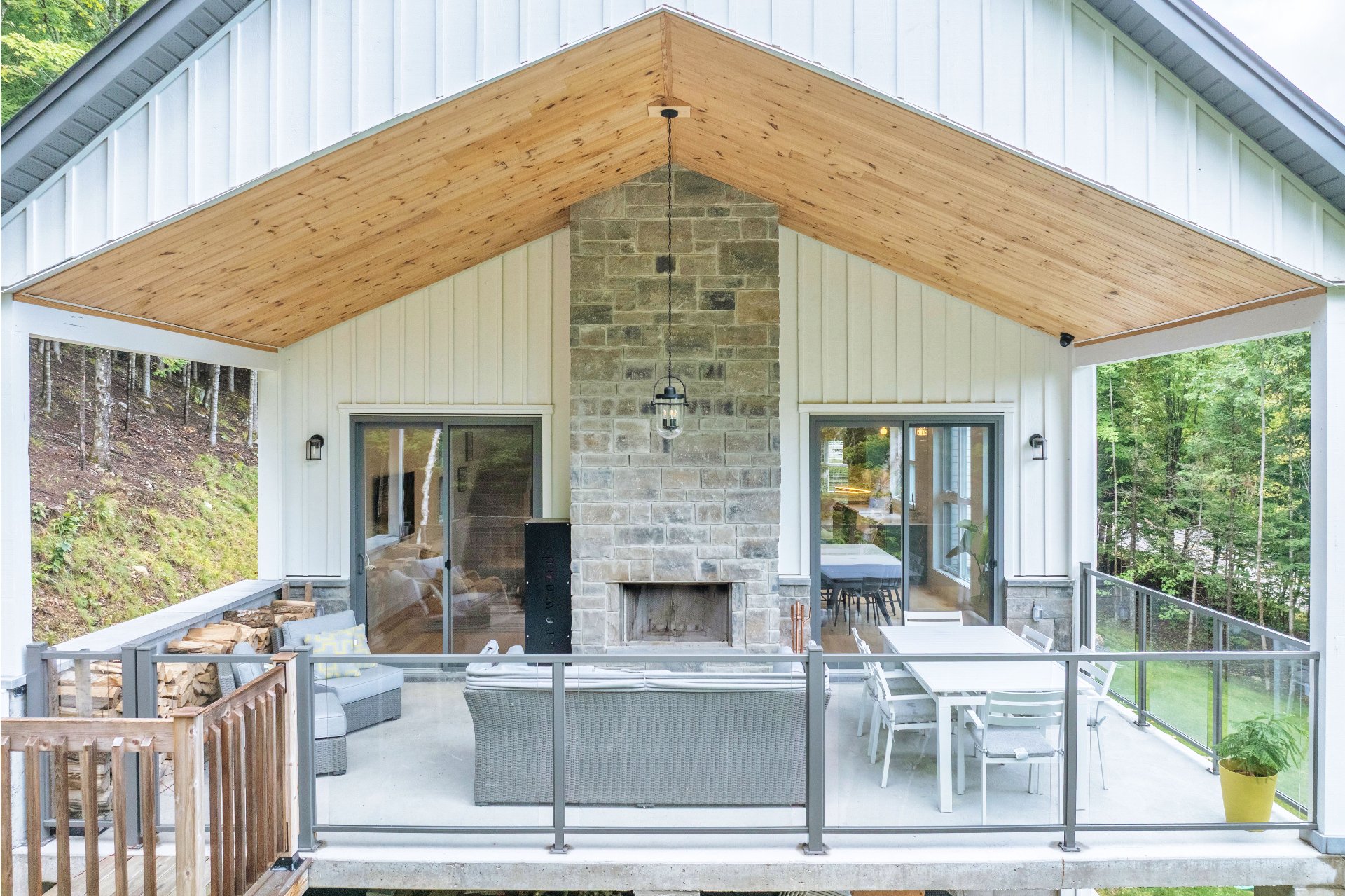 Meubles, électroménagers, essentiels de cuisine, rideaux, stores, luminaires, aspirateur central, télévision au sous-sol, étagère pour le bois de foyer sur le balcon.
