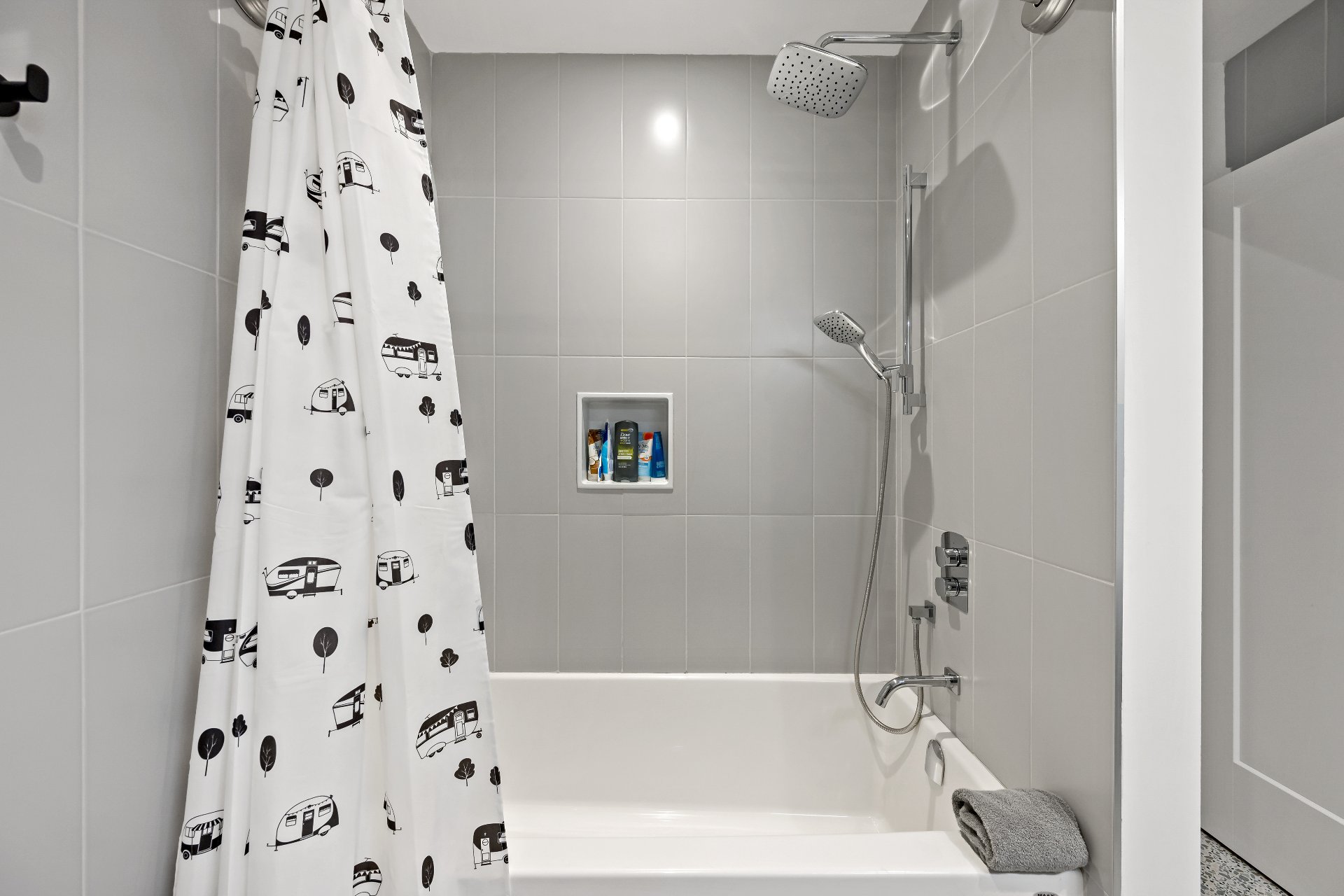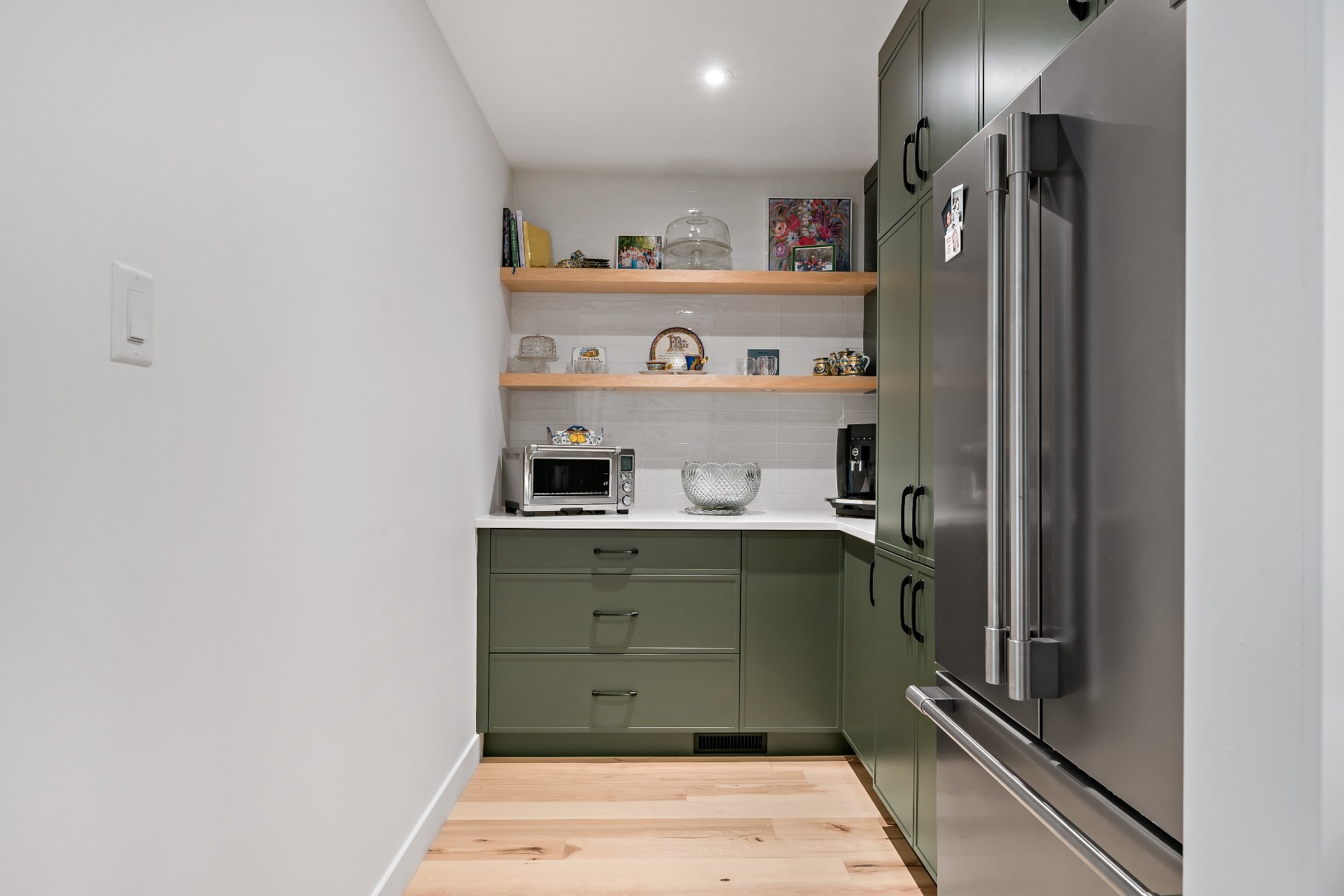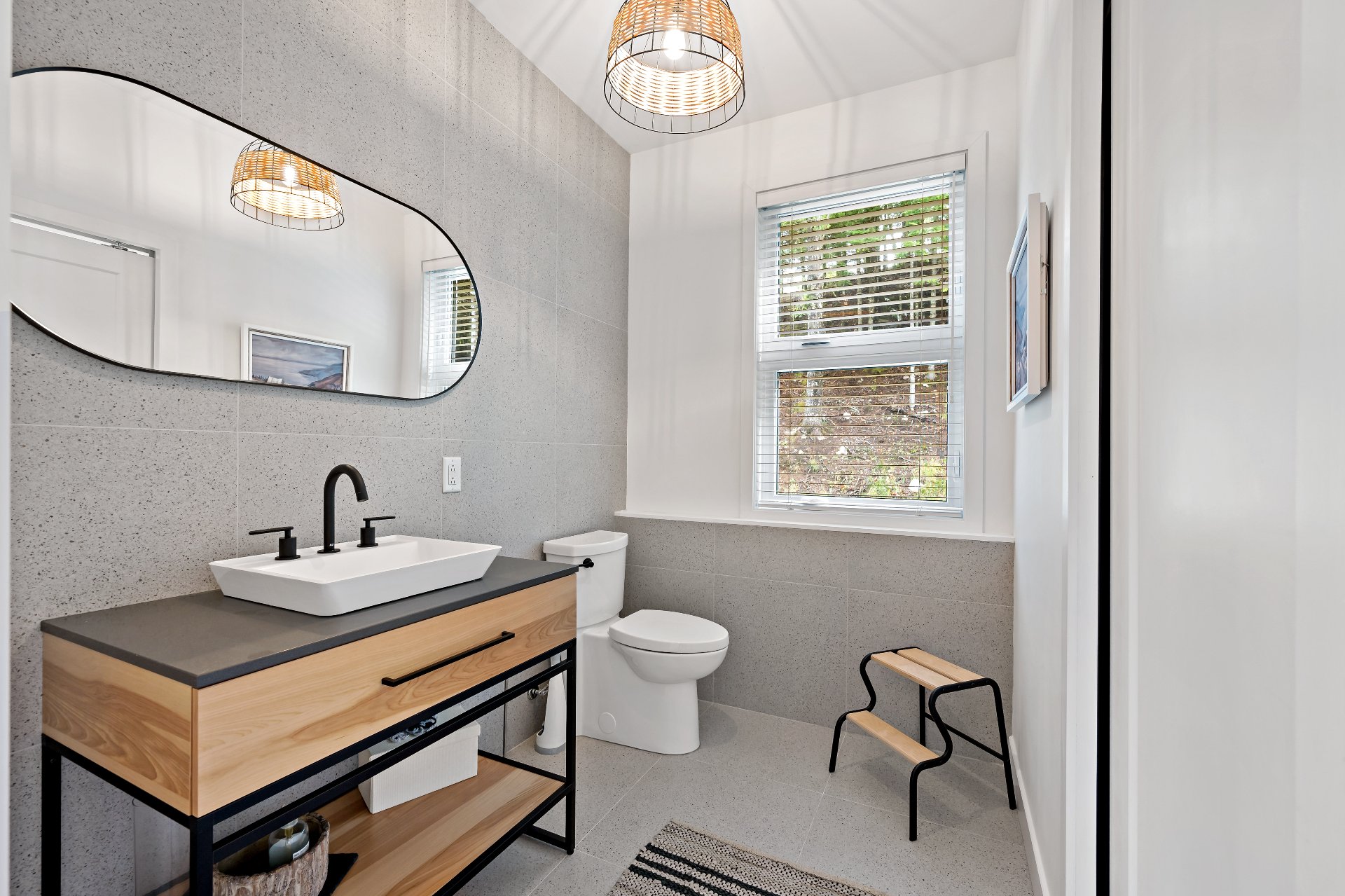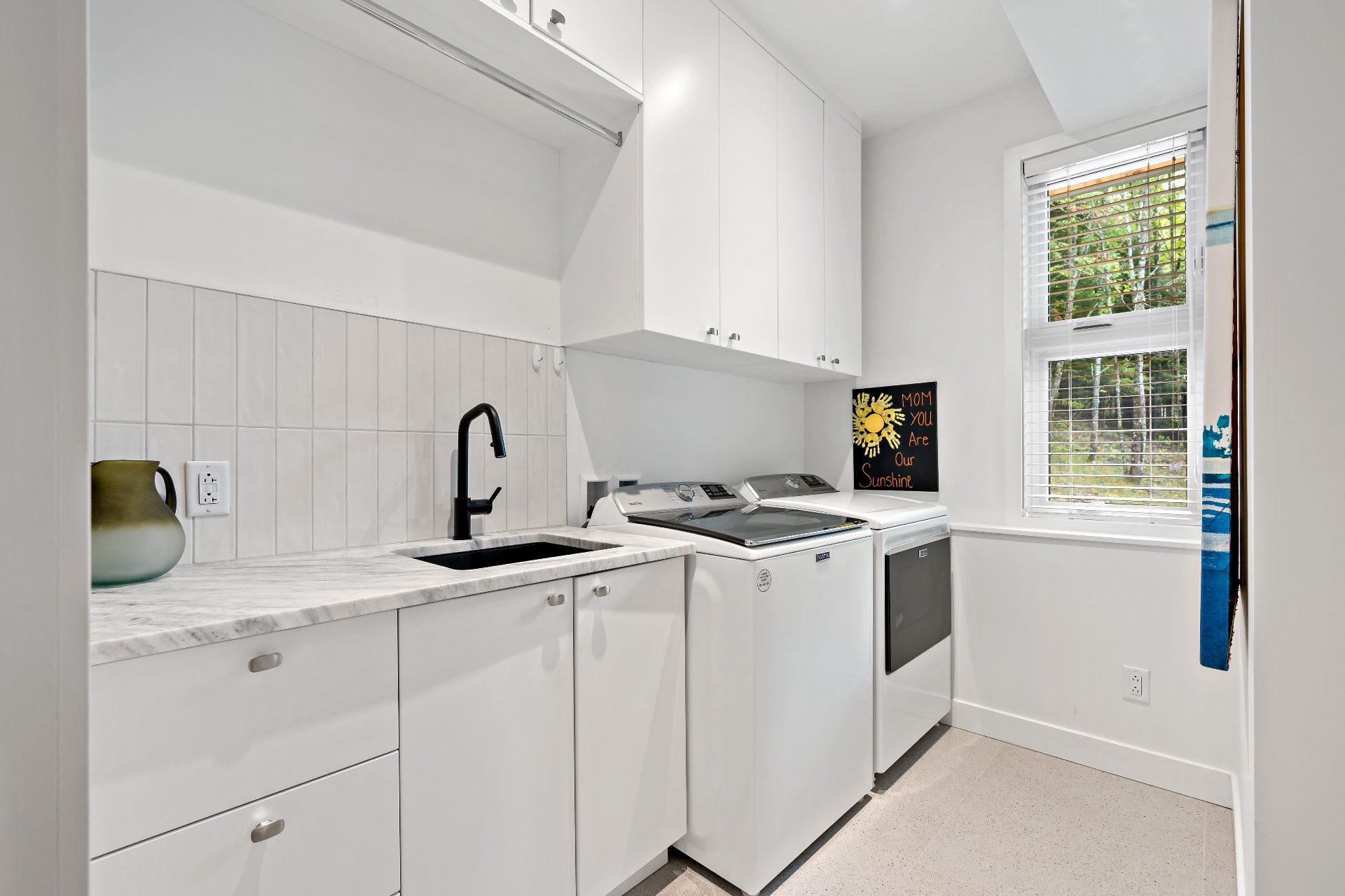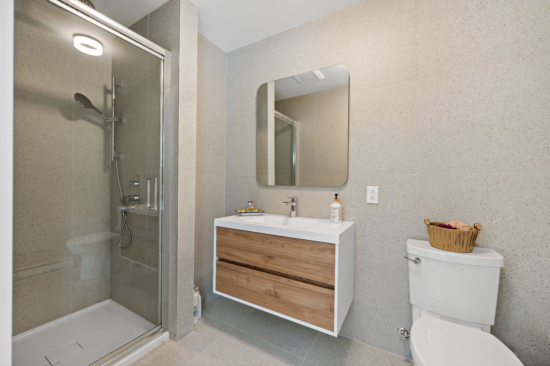 Meubles, électroménagers, essentiels de cuisine, rideaux, stores, luminaires, aspirateur central, télévision au sous-sol, étagère pour le bois de foyer sur le balcon.