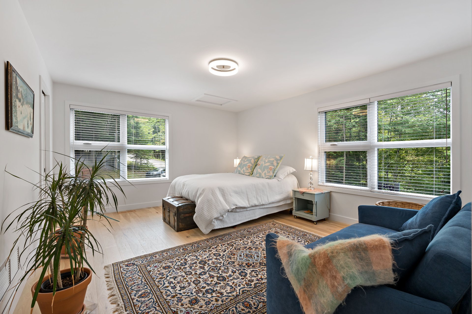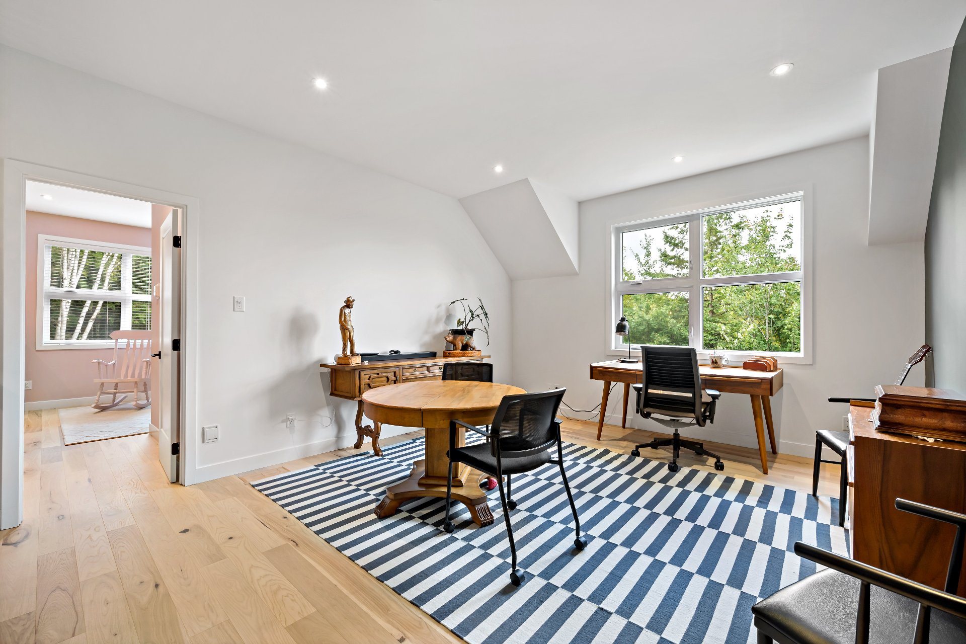 Entrée: Banc d'église foncé; Cuisine : Petit four sur le comptoir et machine à café; Chambre du RDC : tapis bleu et tables de nuit bleues; Bureau : mobilier de bureau; Chambres des maîtres : Semainier à 6 tiroirs, cha...
