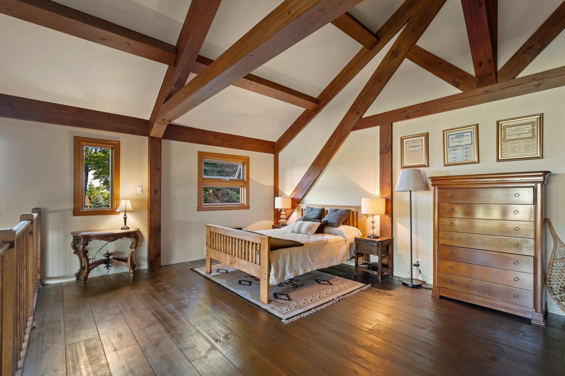 Oeuvres d'art, effets personnels, articles de sport, outils Lit, matelas, lampes de chevet et tapis de la chambre a coucher principale, Bureau dans la chambre du RDJ (gauche) et commode antique dans chambre du RDJ (dr...