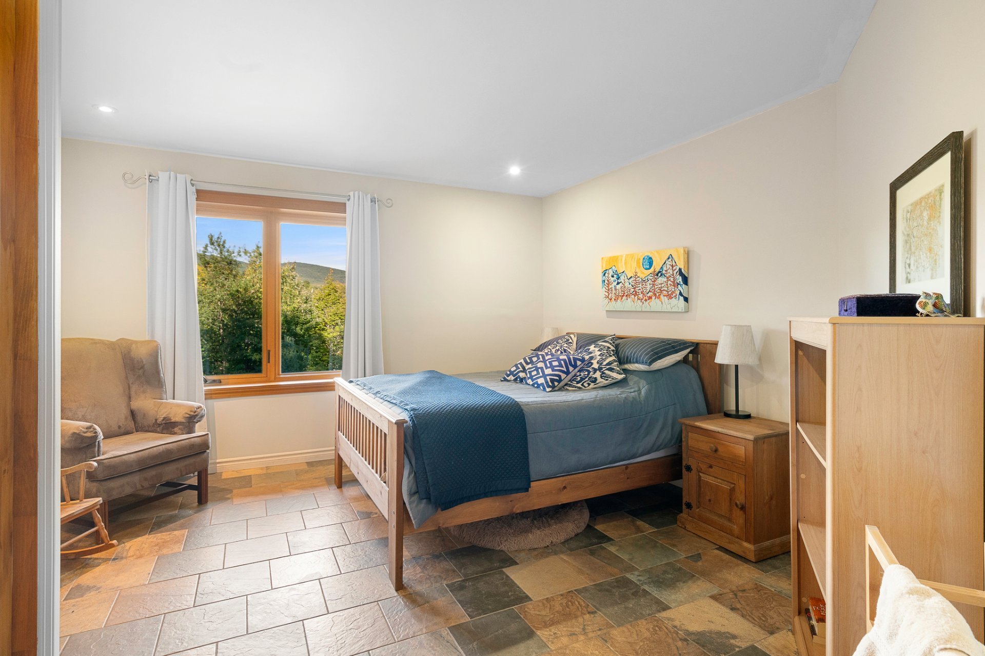 Oeuvres d'art, effets personnels, articles de sport, outils Lit, matelas, lampes de chevet et tapis de la chambre a coucher principale, Bureau dans la chambre du RDJ (gauche) et commode antique dans chambre du RDJ (droite). Certains items de vaisselle et cuisine personnels.