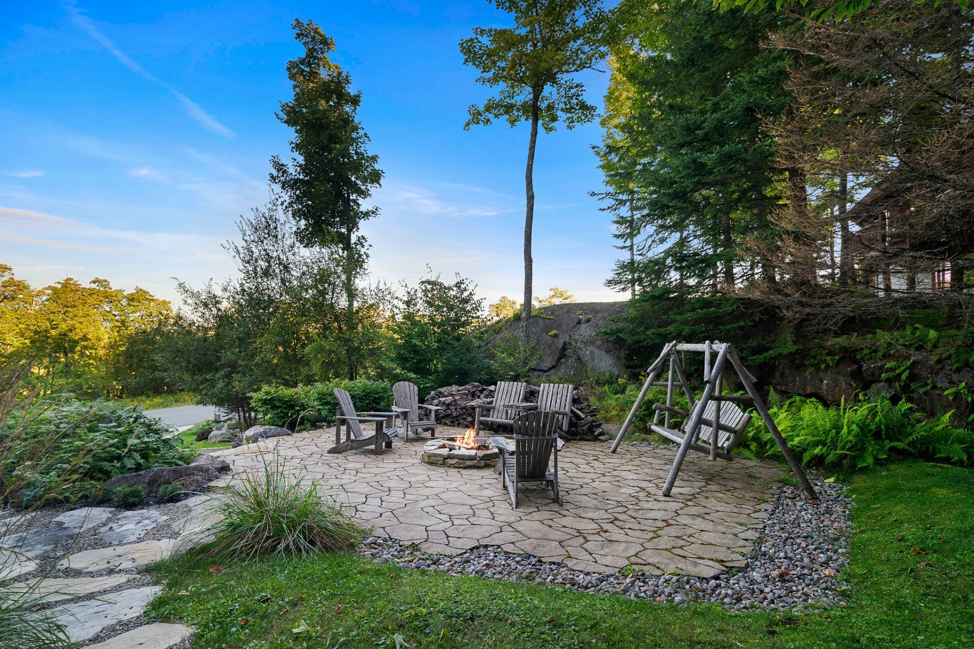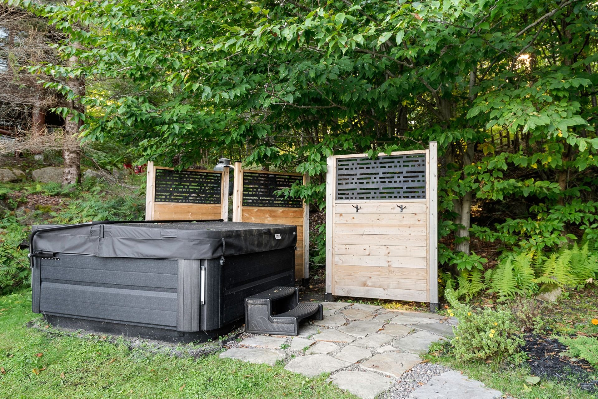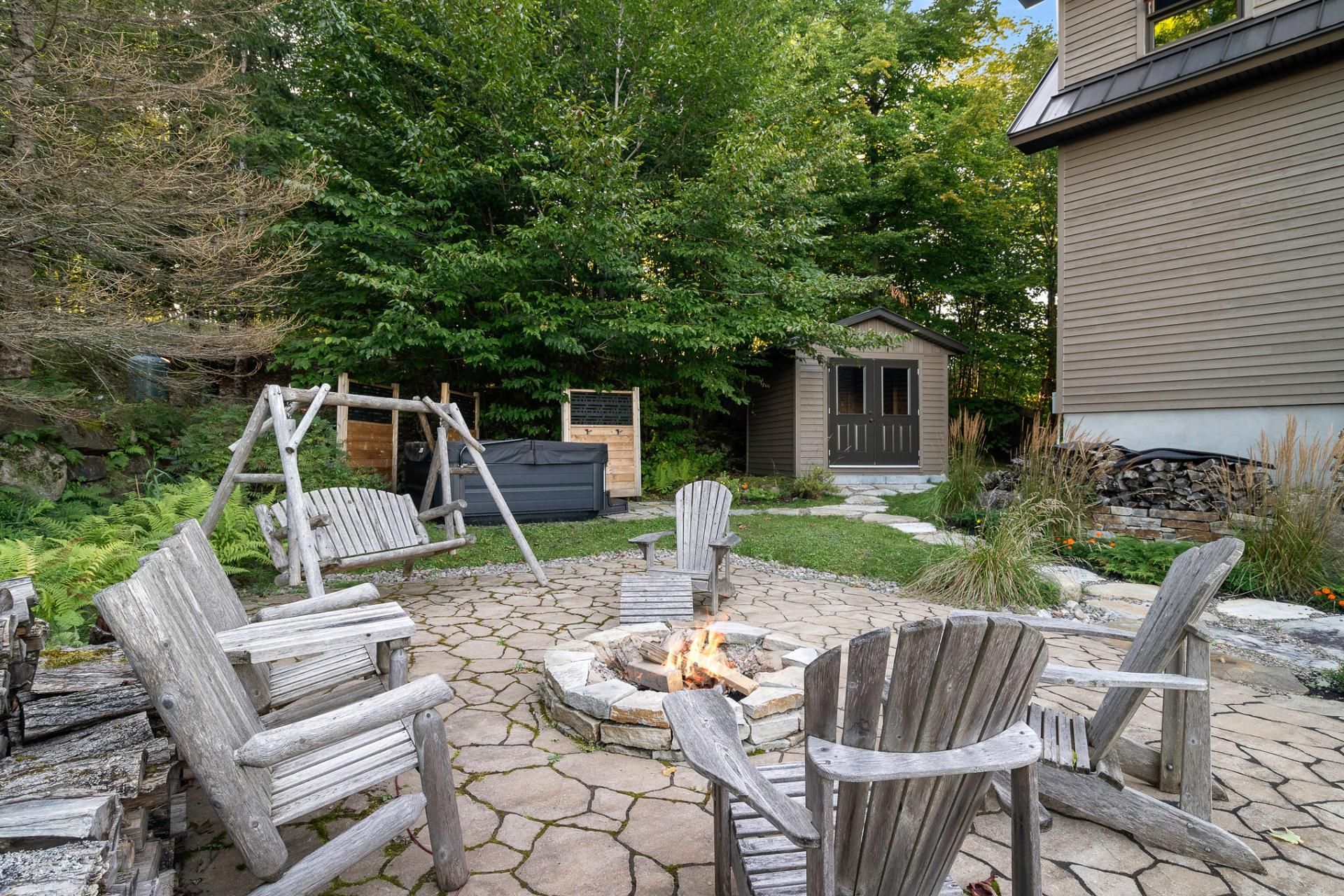 L'aménagement extérieur comprend un espace pour feu, un spa