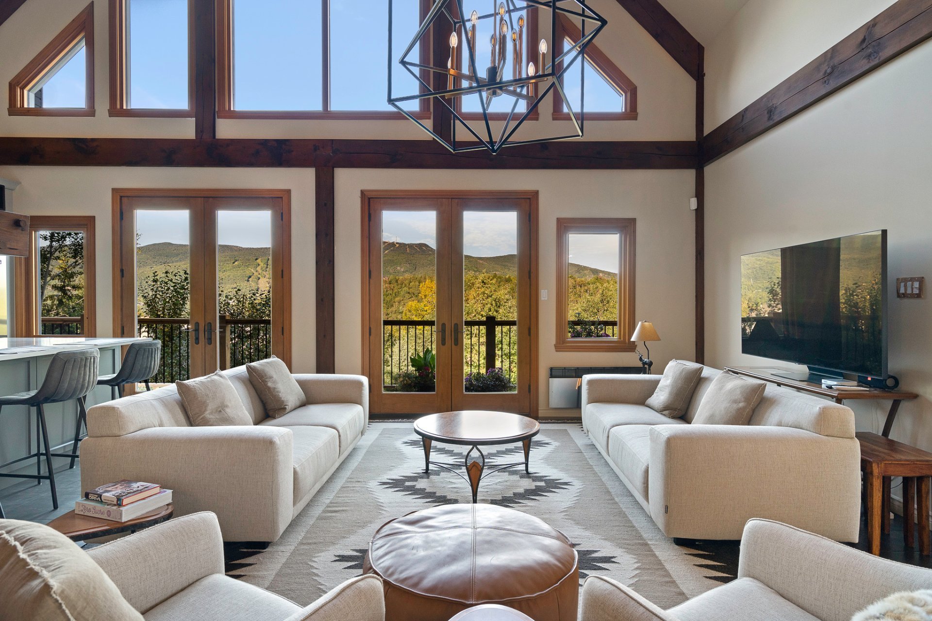 Le salon comprend un plafond cathédrale avec poutres en